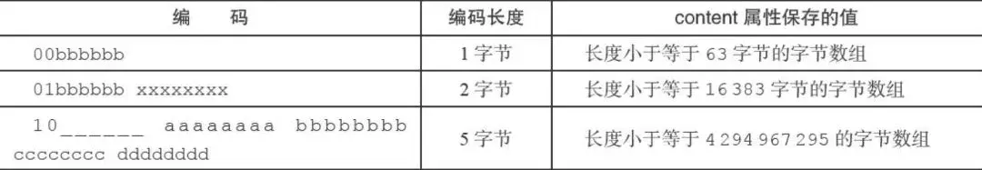 一字节、两字节或者五字节长,值的最高位为00、01或者10的是字节数组编码:这种编码表示节点的content属性保存着字节数组,数组的长度由编码除去最高两位之后的其他位记录;