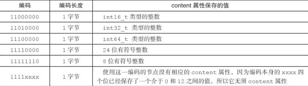 一字节长,值的最高位以11开头的是整数编码:这种编码表示节点的content属性保存着整数值,整数值的类型和长度由编码除去最高两位之后的其他位记录;